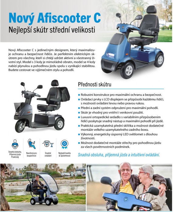 Afiscooter C3 s jedinečným designem navrženým pro maximalizaci ochrany a bezpečnosti řidiče. Jeho vynikající multifunkčnost a snadná obsluha ho předurčuje pro všechny, kteří si chtějí zachovat aktivní, dynamický a všestranný životní styl.
