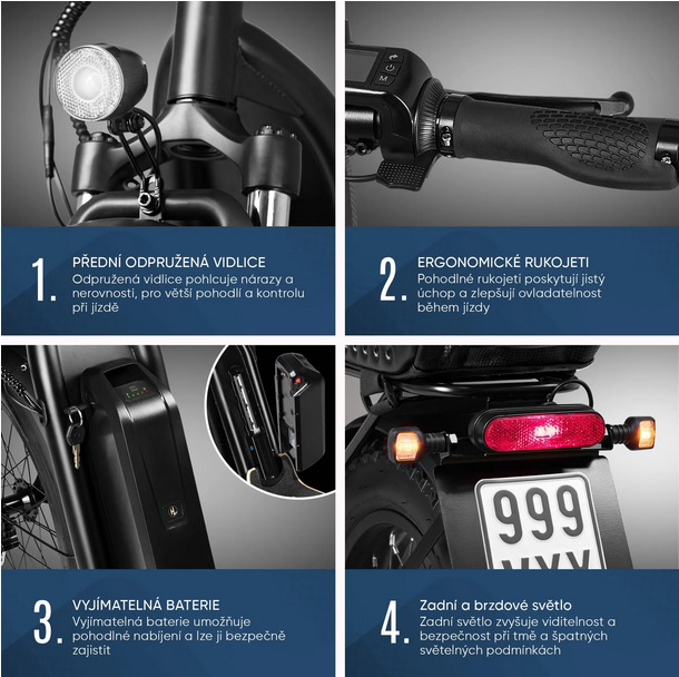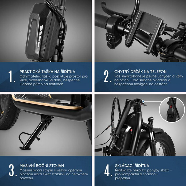 Pro maximální jízdní pohodlí je tento model vybaven výškově nastavitelnými řídítky, hydraulicky odpruženou vidlicí a pohodlným odnímatelným sedadlem. Integrovaný nosič zavazadel je vybaven odnímatelnou, voděodolnou brašnou.
